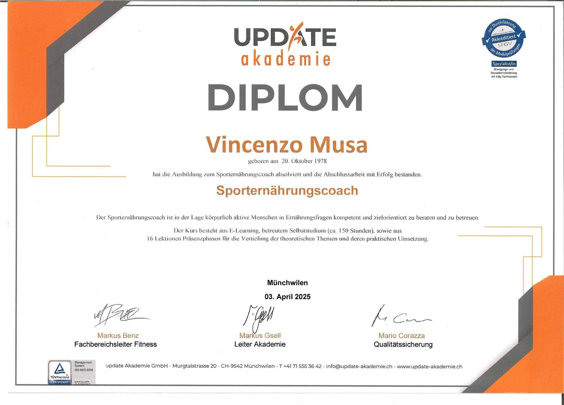 Geboren und aufgewachsen in Italien, absolvierte ich die Höhere Fachschule für Hotel- und Gaststättengewerbe und arbeitete jahrelang als Koch in renommierten Häusern. Seit 2000 lebe ich in der Schweiz, wo ich meine Leidenschaft für gesunde, nachhaltige Küche weiterentwickelt habe. Nach zahlreichen Weiterbildungen und zwei Diplomen – als Ernährungscoach (2022) und Sporternährungscoach (2025) – begleite ich heute Menschen in verschiedenen Lebenssituationen. Mein Diplomprojekt widmete ich meinem Sohn, einem intensiven Eishockeyspieler, für den ich einen vollständigen, leistungsorientierten Ernährungsplan entwickelte.